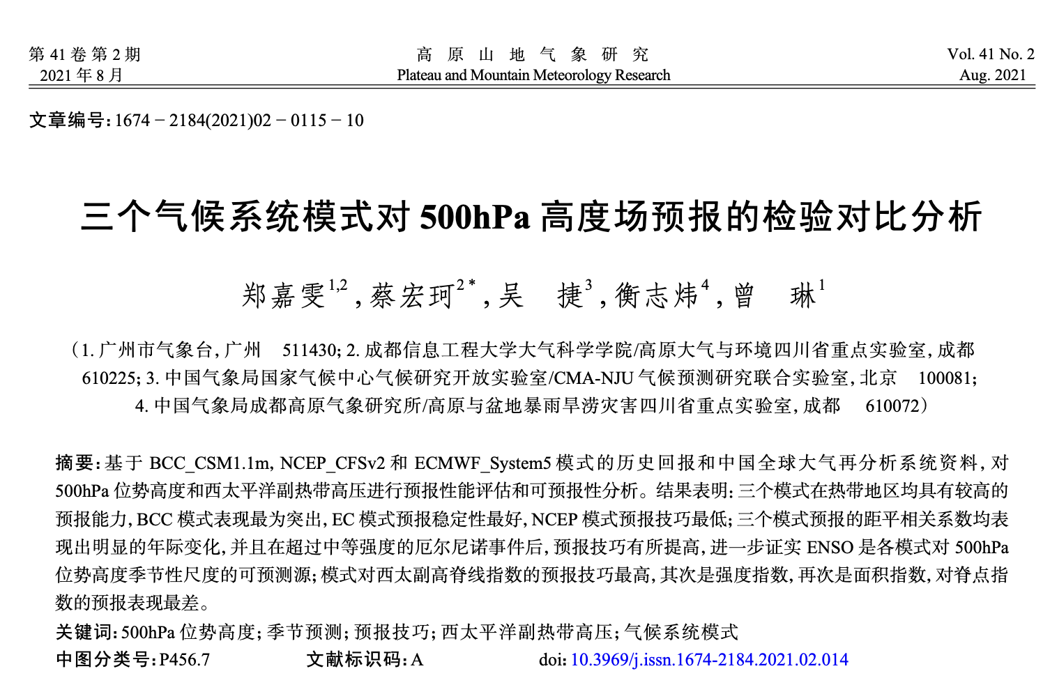 基于 BCC_CSM1.1m,NCEP_CFSv2 和 ECMWF_System5 模式的历史回报和中国全球大气再分析系统资料,对500hPa 位势高度和西太平洋副热带高压进行预报性能评估和可预报性分析。结果表明:三个模式在热带地区均具有较高的预报能力,BCC 模式表现最为突出,EC 模式预报稳定性最好,NCEP 模式预报技巧最低;三个模式预报的距平相关系数均表现出明显的年际变化,并且在超过中等强度的厄尔尼诺事件后,预报技巧有所提高,进一步证实 ENSO 是各模式对 500hPa位势高度季节性尺度的可预测